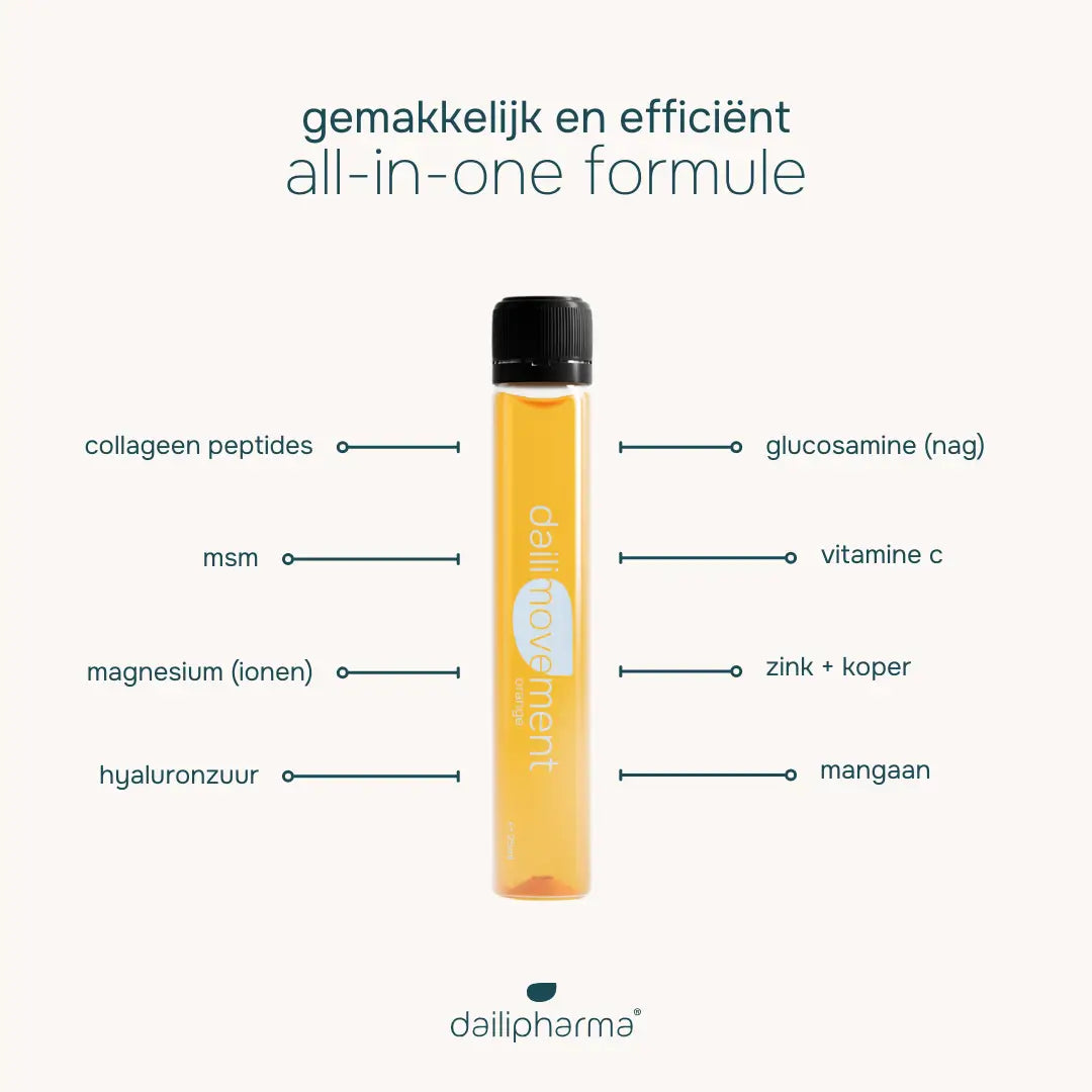 Ingrédients: Eau, hydrolysat de collagène (Peptan®), glucosaminen-acetyl-d, acides alimentaires (acide DL-malique, acide citrique), méthylsulfonylméthane, magnésium, acide L-ascorbique, hyaluronate de sodium, citrate de zinc, bisglycinate de manganèse, gluconate de cuivre, sorbate de potassium, arôme, sucralos